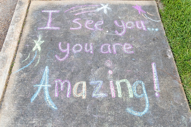 If you’ve got kids, you’ve got floor chalk somewhere! If not, grab yourself some, it’s the best and our girls have used floor chalks in every house that we have lived in. They’ve drawn giant dinosaur murals on the walls of the house (it comes off when it rains)!, written stories on the floor, drawn family pictures and written first words. You can write positive messages, words of affirmation, create 3d photos like the one below, and more! I love the idea of writing a ‘morning message’ on the balcony outside every morning for the girls.